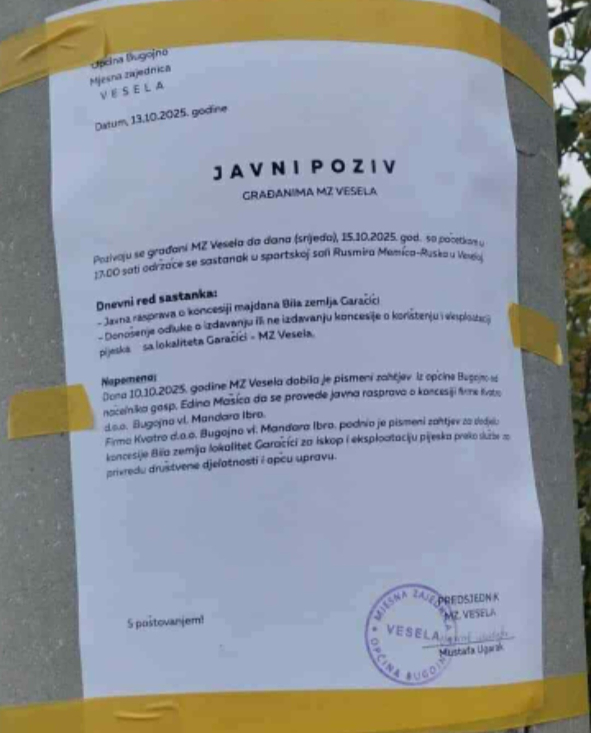 No 13.10.2025., bez ikakve najave, na stubovima za rasvjetu u MZ Vesela osvanuo je poziv za javnu raspravu o koncesiji Mejdana Bila zemlja Garčići, te donošenje odluke o izdavanju ili ne izdavanju koncesije o korištenju i eksploataciji pijeska na lokalitetu Garačići- MZ Vesela. Pri čemu je kao termin za javnu raspravu, u lokalnoj sportskoj sali, naveden – 15.10.2025. Dakle, svega dva dana kasnije.