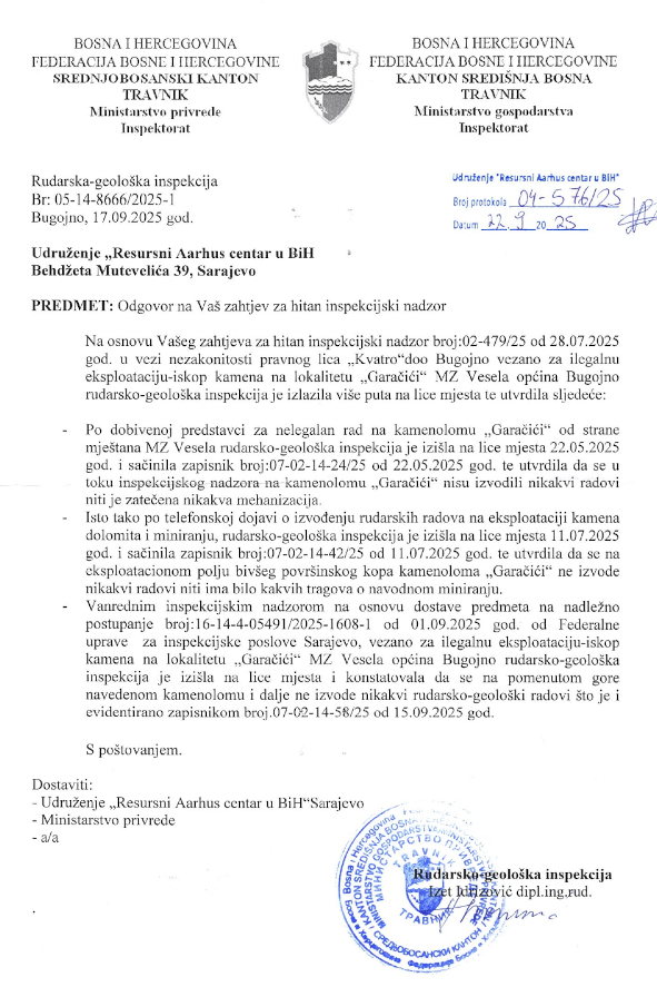 “Po telefonskoj dojavi o izvođenju rudarskih radova na eksploataciji kamena dolomita i miniranju, rudarsko geološka inspekcija je izašla na lice mjesta 11.07.2025. godine… te utvrdila da se na eksploatacionom polju bivšeg površinskog kopa kamenoloma “Garačići” ne izvode nikakvi radovi niti ima bilo kakvih tragova o navodnom miniranju.”, bio je odgovor Arhus centru od Inspektorata SBK, na njihov zajhtjev za hitnim inspekcijskim nadzorom.