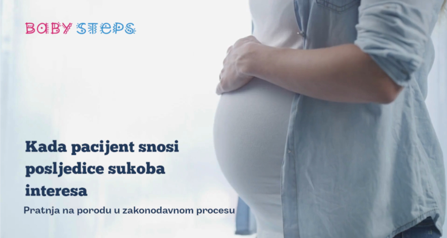 “Kada oni koji trebaju provoditi zakon imaju moć da ga odgode, oslabe ili pretvore u nacrt to više nije pitanje medicine, to je sukob interesa.”, navodi se u videu udruženja “Baby Steps”, koji se bavi problemom opstrukcija pri donošenju zakona koji bi trebao da osigura pravo porodiljama na pratnju pri porodu po svom izboru i koji bi trebao da, osim pružanja sigurnosti ženama u najosjetljivijem trenutku života, bude i alat za borbu protiv akušerskog nasilja i korupcije u porodilištima.