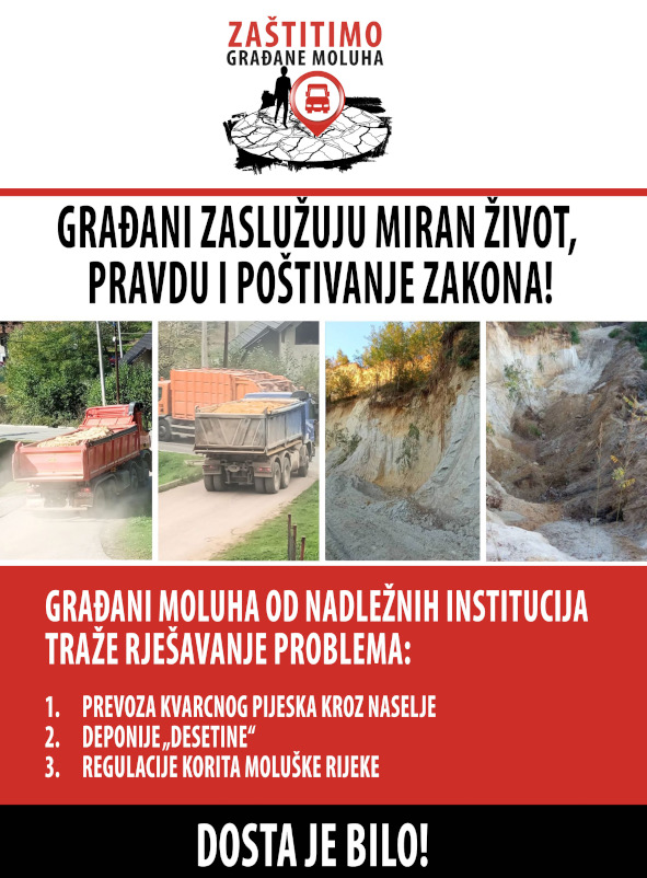 „Ti kamioni, često pretovareni i do 50 tona ukupne nosivosti, devastiraju naše naselje, ulice. U naselju nema trotoara, povećan je saobraćaj vozila komunalnog preduzeća „Komunalac“, kao i svih građana Moluha. Mi smo svakodnevno izloženi prašini od kvarcnog pijeska, imamo snimke, fotografije. Tražili smo od Zavoda za javno zdravstvo da se izmjeri da li stvarno postoji određena količina silicijeva oksida – da donese nalaz i mišljenje da li je zdravlje građana ugroženo, međutim do dan danas nemamo odgovor. Obraćali smo se gradskim, kantonalnim i federalnim inspekcijama – svi su se izjasnili da su nenadležni za rješavanje pitanja problema ugroženosti zdravlja. Od ministrice zdravlja smo tražili da nam ona odgovori ko je nadležan za rješavanje tog pitanja, no – i ministrica se oglasila nenadležnom. Od premijera kantona nismo dobili nikakav odgovor na naš upit, zato smo danas ovdje sa ovom inicijativom.“