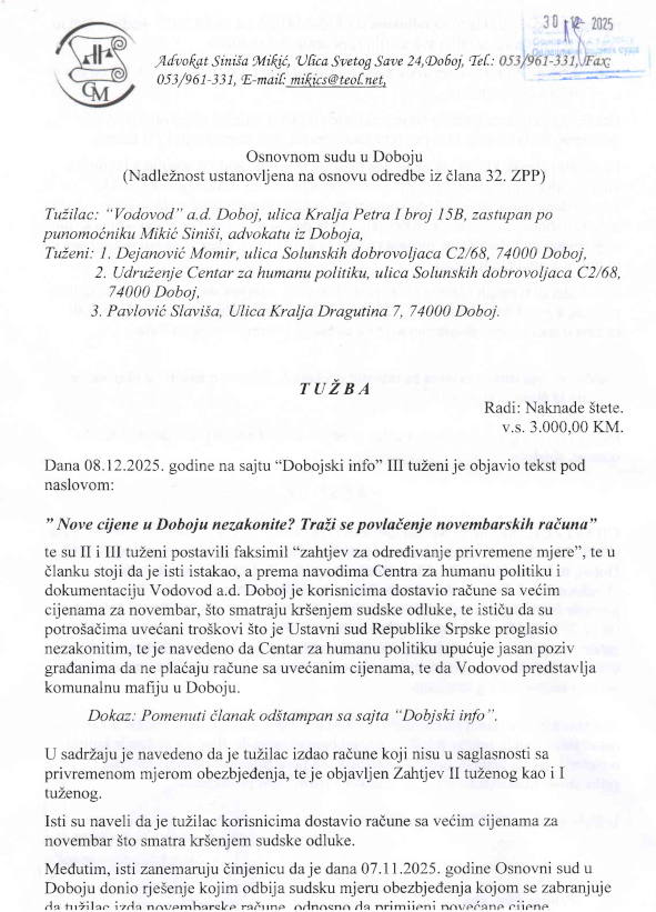 U petak, 23.01.2026., tužba, napisana od strane opunomoćenika Siniše Mikića, koji se “specijalizovao” za ovakve slučajeve, uručena je Udruženju Centar za humanu politiku, predsjedniku ovog udruženja, poznatom građanskom aktivisti Momiru Dejanoviću, te, novinaru Slaviši Pavloviću. Ukupno odštetni zahtjev je na 3.000 KM.