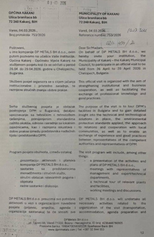 “U ime kompanije DP Metals BH d.o.o. ovim putem pozivamo na učešće Vaše institucije, Općina Kakanj – Općinsko vijeće Kakanj, na službenom posjetu koji će se održati u periodu 26.04. do 29.04.2026. godine u Chelopechu, Bugarska. Službeni posjet organizora se sa ciljem jačanja institucionalne i privredne saradnje, te razmjene stručnih znanja i dobre prakse” – stoji, između ostalog, u pozivu općinskim vlastima Kaknja iz DP Metali, sa napomenom da će kompanija snositi sve troškove posjete Bugarskoj.