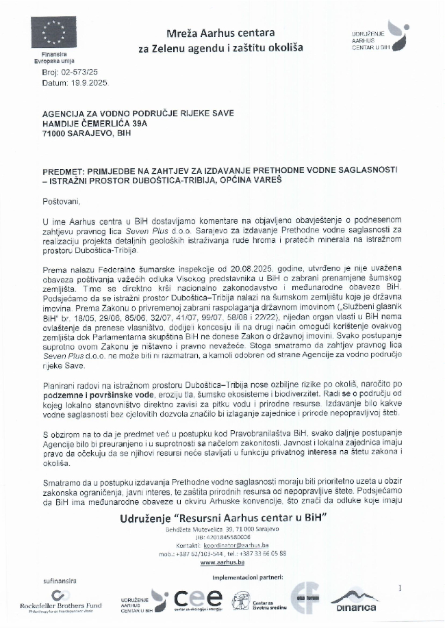 Ovo su argumenti koje su u petak, 19.09.2025., dostavili iz Aarhus centra u BiH Agenciji za vodno područje rijeke Save Sarajevo (AVP), kojoj se u proceduri obezbjeđenja potrebnih nedostajućih dozvola za istražne radove obratio investitor “Seven Plus” i zatražio vodnu saglasnost.