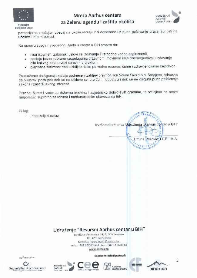 Tražeći da Agencija odbije podneseni zahtjev pravnog lica iz Sarajeva, odnosno da obustavi postupak dok se ne otklone svi utvrđeni nedostaci i dok se ne osigura puno poštivanje zakona i zaštita javnog interesa, Aarhus centar smatra da zahtjev Seven Plusa ne može biti ni razmatran, a kamoli odobren od strane Agencije.