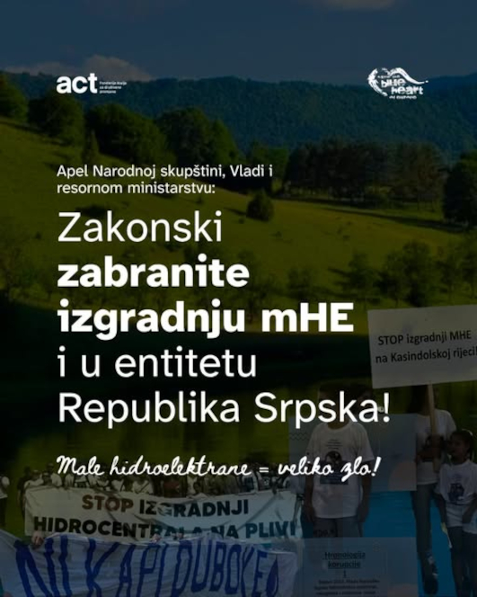 “Uz poruku da se naše nebo ne smije pokušati dekarbonizovati uništavanjem prirodnih vodotoka koji nose čistu i pitku vodu, koje će sve više trebati u godinama i decenijama globalnog zatopljavanja pred nama, upućujemo apel za usvajanje zakonske zabrane izgradnje mHE i u Republici Srpskoj.”