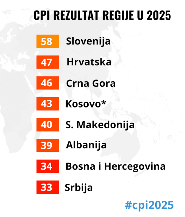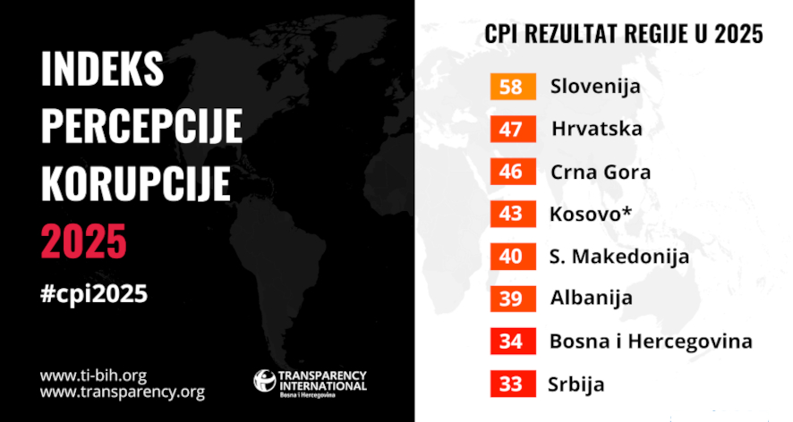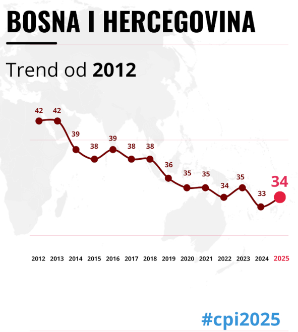Bosna i Hercegovina, osim što je od 2012. do 2025. zabilježila pad ocjene percepcije korupcije za 8, u posljednjih 6-7 godina, umjesto neophodnog napretka, bilježi stagnaciju. Koja u realnom životu rezultira daljim padom životnog standarda i kvaliteta života građana, rastom nestabilnosti i nesigurnosti, odlaskom radno sposobnog stanovništva iz zemlje,… Uz istovremeno iživljavanje političara nad građanima, pokušaje smanjivanja nivoa ljudskih prava i građanskih sloboda, uključujući i slobodu javne riječi i organizovanja, podsticanje propagande i govora mržnje u javnom prostoru, te, demonstriranje spremnost na sve(!), u cilju opstanka na vlasti i zaštite kriminalno stečenog ličnog bogatstva.