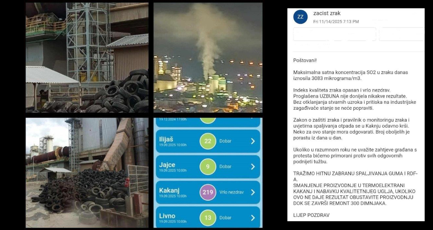 “Zakon o zaštiti zraka i pravilnik o monitoringu zraka i uvjetima spaljivanja otpada se u Kaknju odavno krši. Neko za ovo stanje mora odgovarati. Broj oboljelih je porastu iz dana u dan. Ukoliko u razumnom roku ne uvažite zahtjeve građana bićemo primorani protiv svih odgovornih podnijeti tužbu. Tražimo hitnu zabranu spaljivanja guma i RDF-a” – naveli su u svom zahtjevu eko aktivisti i, kao i lokalne vlasti, najavili organizovanje protesta.