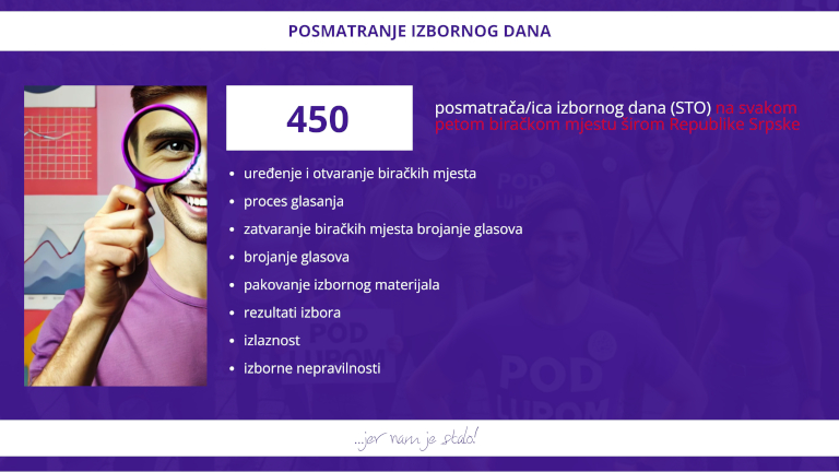 Iz Koalicije „Pod lupom“ su najavili i kako će oko 450 posmatrača/ica Koalicije „Pod lupom“ na izborni dan posmatrati izborni proces na skoro svakom petom biračkom mjestu u Republici Srpskoj.