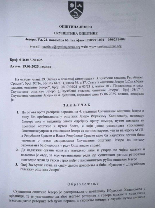 “Da nadležni organi ispitaju navedeno lice i utvrde po čijem je zadatku i nalozima ovdje, za koje organizacije radi, jer huškačkom ratnom retorikom očigledno želi da unosi strah među stanovništvo rubne opštine Jezero” – dio je iz Zaključaka SO Jezero.