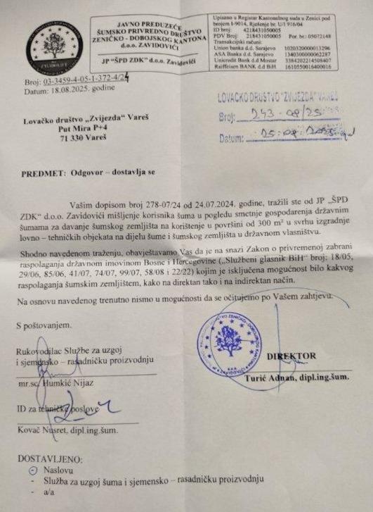 “U posjedu smo odbijenice JPD “ŠPD ZDK” d.o.o. Zavidovići, koje gazduje šumama na području Vareša, na zahtjev lokalnog Lovačkog udruženja “Zvijezda” da im se dodijeli svega 300 m2 za izgradnju lovno-tehničkih objekata. U odgovoru lovcima su eksciplitno naveli da im ne mogu izaći u susret, pozvavši se na Zakon o privremenoj zabrani raspolaganja državnim zemljištem, kojim je isključena mogućnost raspolaganja šumskim zemljištem, kako na direktan tako i na indirektan način. To je licemjerno, jer je očito da za njih važi zabrana, a za bahate i bezobzirne investitore, uništivače naše prirode to ne važi” – kažu eko aktivisti.