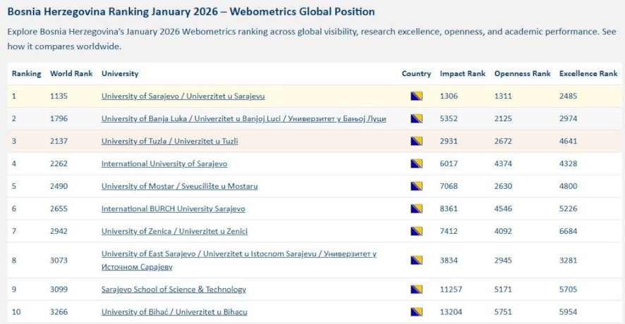 Na ovogodišnjem januarskom izdanju Webometrics rangiranja visokoškolskih intitucija u svijetu nalazi se i 42 sa sjedištem u BiH. Ubjedljivo najbolje rangiran je Univerzitet u Sarajevu, koji se nalazi na 1135. mjestu, što je za gotovo 500 mjesta napredovanje u odnosu na prije dvije godine, kada je bio na 1612. mjestu.