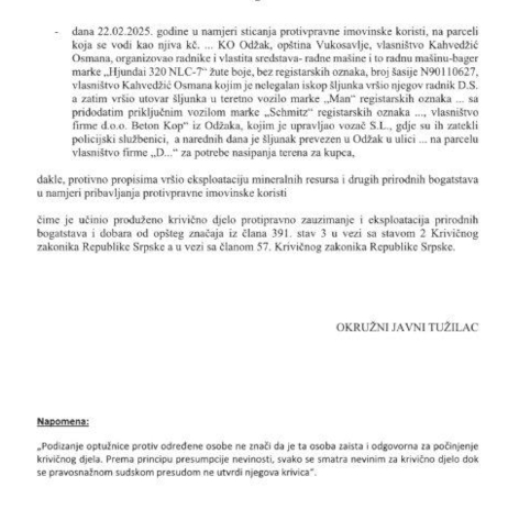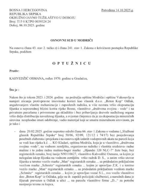 “Optuženi se tereti da je, nakon što je tokom 2023. i 2024. godine na području opštine Modriča i Vukosavlje u namjeri sticanja protivpravne imovinske koristi kao vlasnik d.o.o. “Beton Kop” Odžak, angažovanjem vlastite mehanizacije i zaposlenih radnika, u više navrata vršio eksploataciju šljunka u neposrednoj blizini korita rijeke Bosne, vlasništvo “društvena svojina – vode” i na privatnim parcelama i privremeno ga skladištio i bez pribavljanja dozvole nadležnog organa vršio dalju distribuciju šljunka, pa je tako u februaru mjesecu 2025. godine protivno propisima vršio eksploataciju mineralne sirovine – šljunka na području opštine Modriča, na parceli koja se vodi kao rijeka KO Kladari, vlasništvo “društvena svojina – vode” na vodnom zemljištu i na području opštine Vukosavlje, na parceli koja se vodi kao njiva KO Odžak, vlasništvo Kahvedžić Osmana, koristeći vlastita sredstva – radne mašine i angažujući svoje radnike, vršio nelegalan iskop šljunka, utovar šljunka u teretna vozila koja su u vlasništvu firme d.o.o. “Beton Kop” iz Odžaka, te prevoz šljunka u Odžak a za potrebe nasipanja terena za kupca” – navedeno je u optužnici OJT.