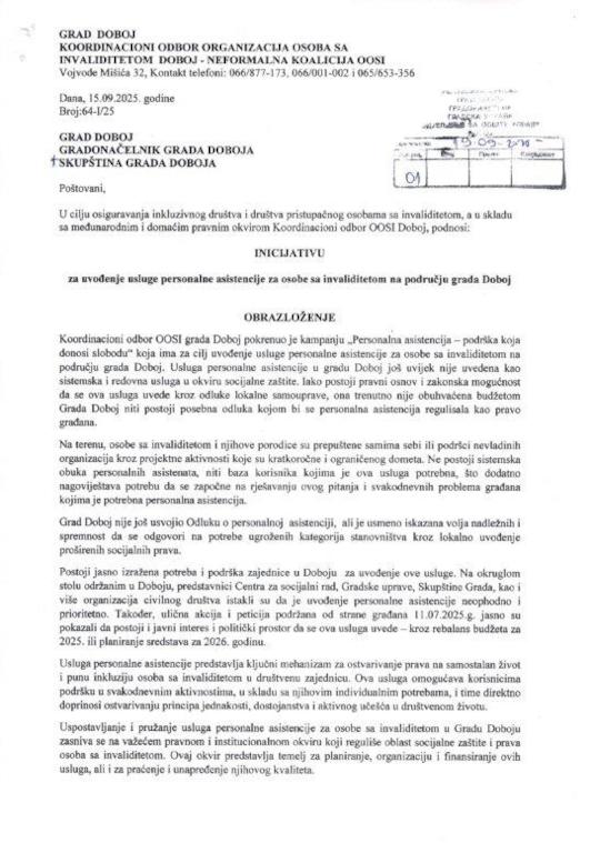 Organizacije civilnog društva, koje u gradu na tri rijeke okupljaju osobe sa poteškoćama, već par godina unazad pokušavaju da dobiju status u budžetu, koji će ih tretirati kao OCD od posebnog društvenog interesa, te su 19.09.2025. godine obnovili Inicijativu za proglašenje OCD od značaja za Grad Doboj. Inicijativu su predali sa Inicijativom za uspostavljanje personalne asitencije na području Grada Doboj, u čijoj pripremi su radili prethodnih mjeseci u ovoj godini, odnosno od aprila.