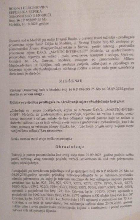 Osnovni sud u Modriči poništio je svoju raniju odluku, od 08.09.2025. godine, kojom je odredio privremena mjeru obezbjeđenja i naložio šljunkarskom preduzeću „Martić Inter-copp“ d.o.o. Modriča da bez odlaganja napusti parcele na lokalitetu Crkvina i Novo selo kod Šamca, koje se nalaze u posjedu porodice Tadić, te da sa istih odveze svoja vozila i građevinsku mehanizaciju, kao i da hitno prestane sa eksploatacijom šljunka.