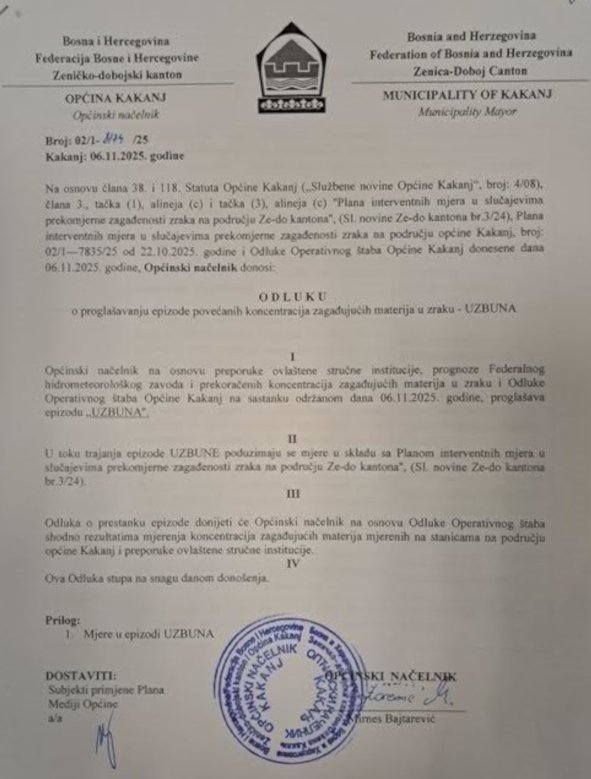 Zbog kritične koncetracije zagađujućih materija i ekstremno lošeg kvaliteta zraka u Kaknju, načelnik ove općine, Mirnes Bajtarević, jutros, 06.11.2025., je donio odluku o proglašenju “Uzbune”.
