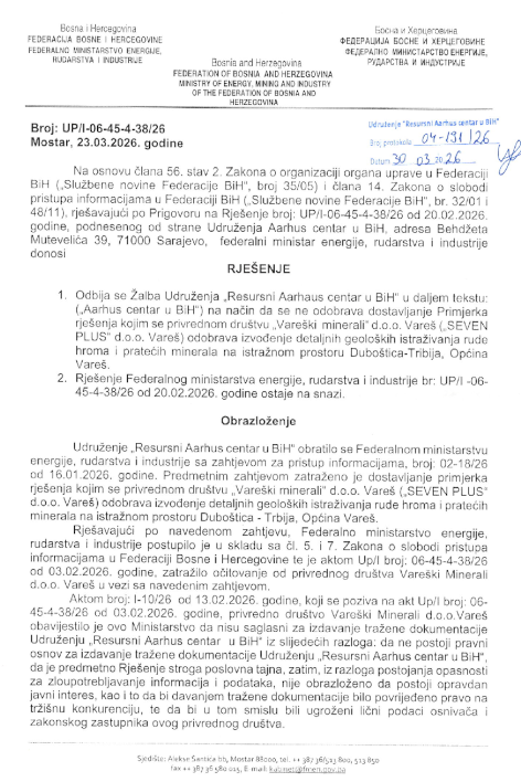 U odgovoru koji je 30.03.2026. godine od Federalnog ministarstva dobilo Udruženje „Resursni Aarhus centar u BiH”, navedeno je da su razmotrili žalbe eko aktivista, te da su odlučujući po njoj procjenili da nisu prekršili zakonske odredbe, kao i da nije osnovano obrazloženje žalitelja žalbe pozivanjem na Aarhusku konvenciju i da su imali pravo učešća javnosti u postupku odobravanja ministarstva prilikom odobravanja ministarstva za geološka istraživanja.