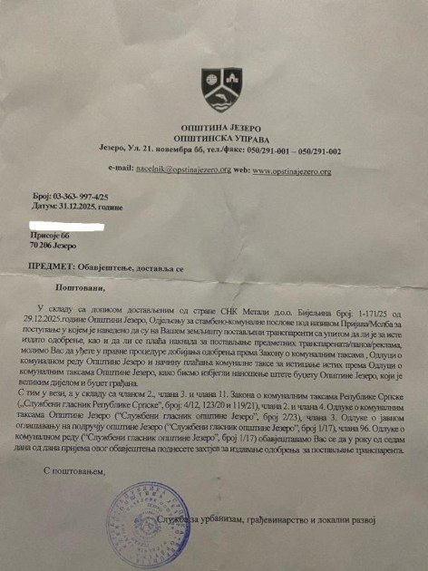 “U skladu sa dopisom od strane SNK Metali d.o.o. Bijeljina Opštini Jezero pod nazivom Prijava/Molba za postupanje, u kojem je navedeno da su na vašem zemljištu postavljeni transparenti, sa upitom da li je za iste izdato odobrenje, kao i da li se plaća naknada za postavljanje predmetnih transparenata/panoa/reklama. Molimo da uđete u procedure dobijanje odobrenja prema Zakonu o kumunalnim taksama, Odluci o komunalnom redu Opštine jezero i načinu plaćanja komunalne takse za isticanje istih prema Odluci o komunalnim taksama Opštine Jezero, kako bi smo izbjegli štetu budžetu opštine Jezero, koji je velikim dijelom i budžet građana” – stoji u dopisu, adresiranom građanima koji su u na svojim posjedima istakli transparente protiv rudarenja u Jezeru.