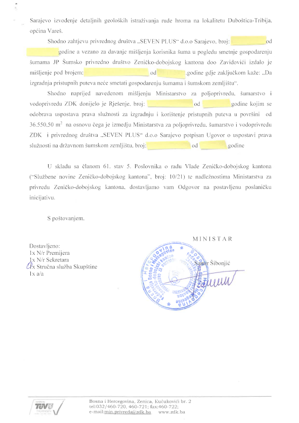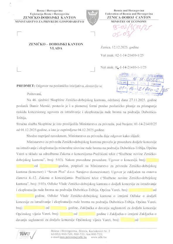 Odgovor, ako se to može tako nazvati, dobio je na poslaničku inicijativu i poslanik Memić, ali kao i u slučaju sa Rudnikom “Rupice”, sa zatamnjenim svim bitnim podacima iz ugovora Vlade ZDK i koncesionara.