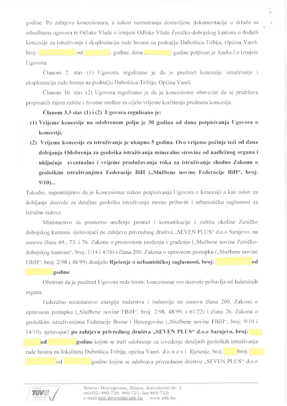 Sa cenzurom i skrivanjem informacija od javnosti, Vlada ZDK nastavila je i u odgovoru na inicijativu za poništenje koncesije za istražni prostor Duboštica — Tribija na području općine Vareš i otvaranje rudnika hroma, koncesionara “Seven Plus” d.o.o. Sarajevo (promjenom imena i sjedišta sada ,,Vareški minerali” d.o.o. Vareš). Ta inicijativa upućena je od strane 50 organizacija civilnog društva iz cijele BiH i mjesnih zajednica u slivu rijeke Krivaje Vladi ZDK, kao i od poslanika u Skupštini ZDK Damira Memića.