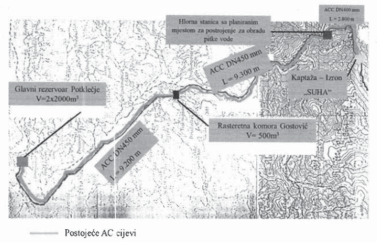 “Grad Zavidovići i okolna mjesta se snabdijevaju sa izvorišta Suha na koti 443 mnv čiji kapacitet iznosi 160 l/s. Kao moguća dopuna izvorišta postoji i izvorište Tajašnica sa kapacitetom 15-30 l/s koje je trenutno ubačeno u sistem. Oba izvorišta se nalaze na prostoru parka prirode Tajan, naselje Kamenica. Transportni vodovod od izvorišta Suha do hlorne stanice Kamenica u dužini cca 2,4km je od azbestnocementne (AC) cijevi profila fi 400mm. Iz hlorne stanice dalje se pruža transportni cjevovod od AC cijevi profila fi 450mm do prekidne komore u dužini 8,8 km i dalje se nastavlja od istog profila u dužini od 8,9 km do glavnog rezervoara zapremine 2×2000 m3”, navodi se u Informaciji Službe za upravu poljoprivrede, vodoprivrede i komunalnih poslova Grada Zavidovići broj 08-45-22/25-AP-85.